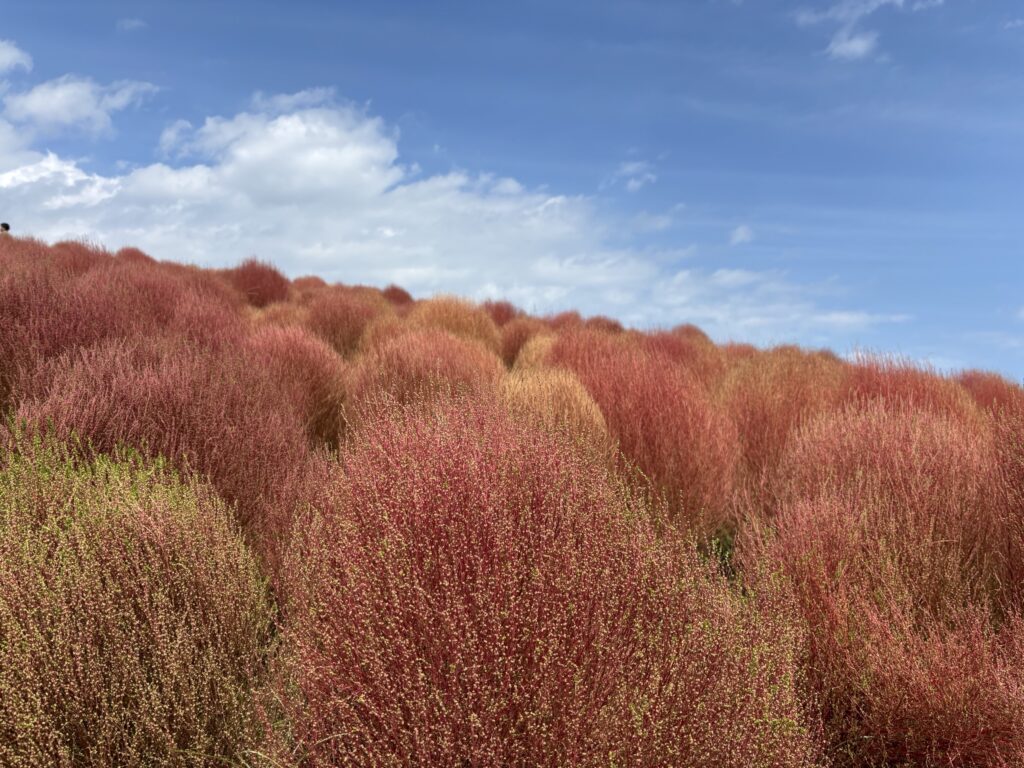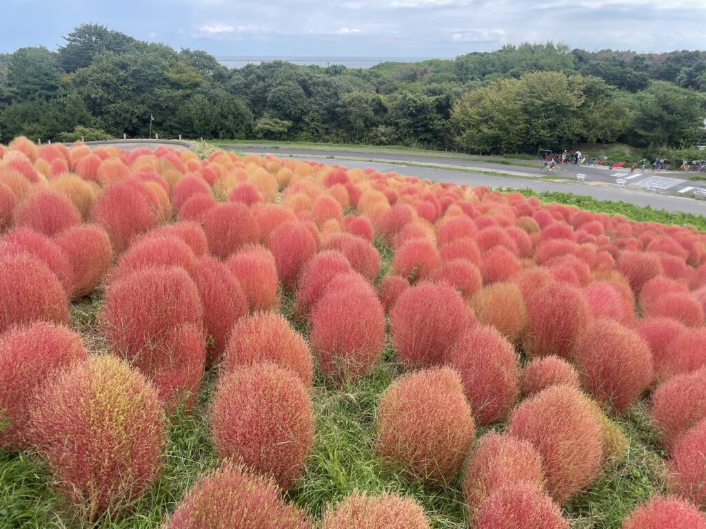 この季節はみはらしの丘に行くと丘一面に広がったコキアの紅葉を楽しむことができます。