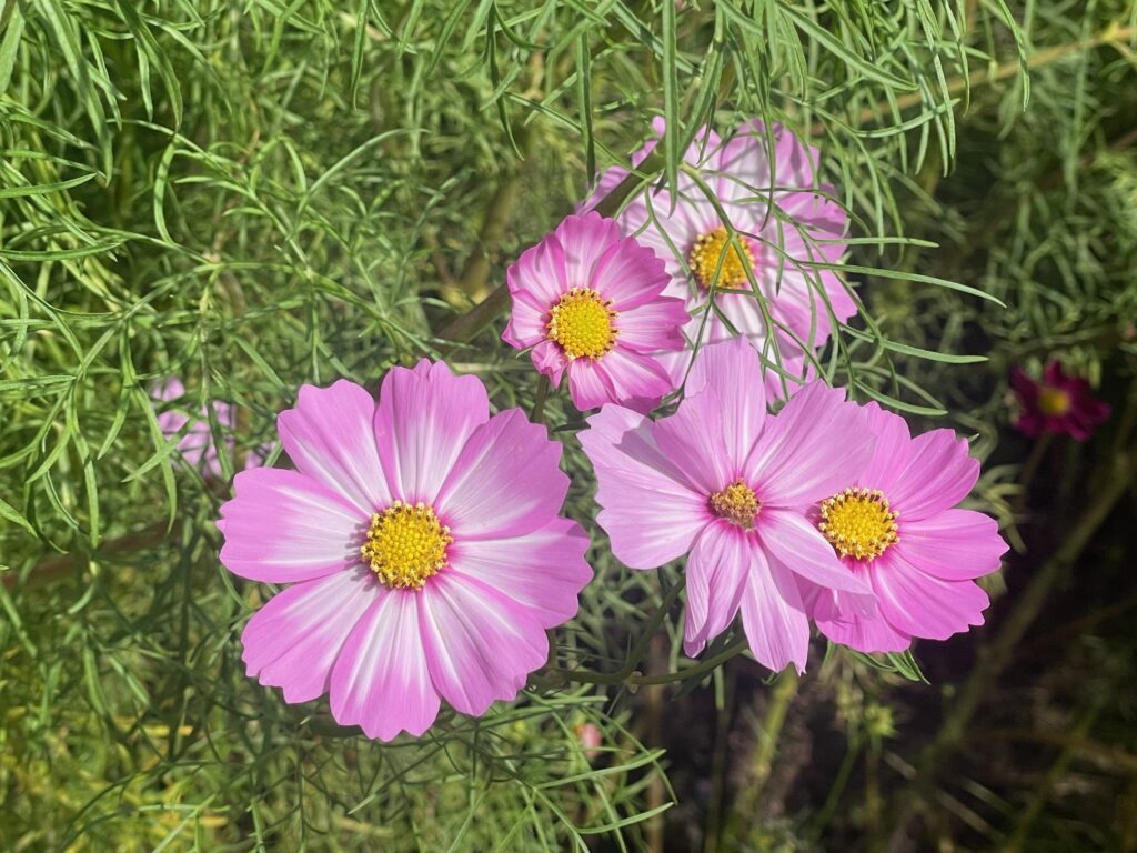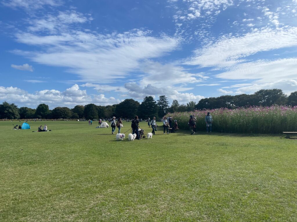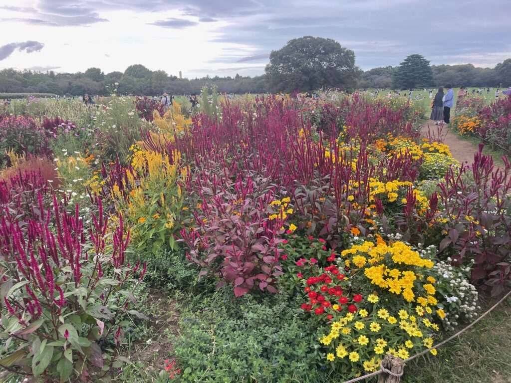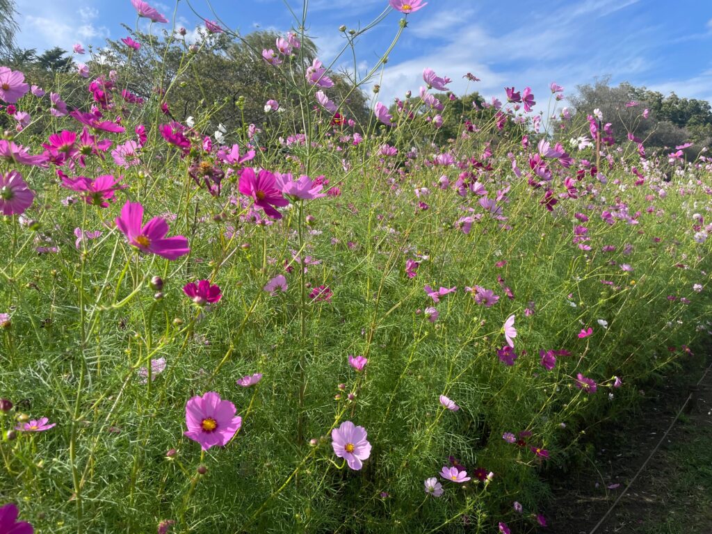 The park is planted seasonally, so visitors can enjoy flowers in every season. The cosmos are a delight in the current season. The sight of cosmos in a variety of colours, including pale pink and white, swaying in the wind under a blue sky is a heartwarming sight.