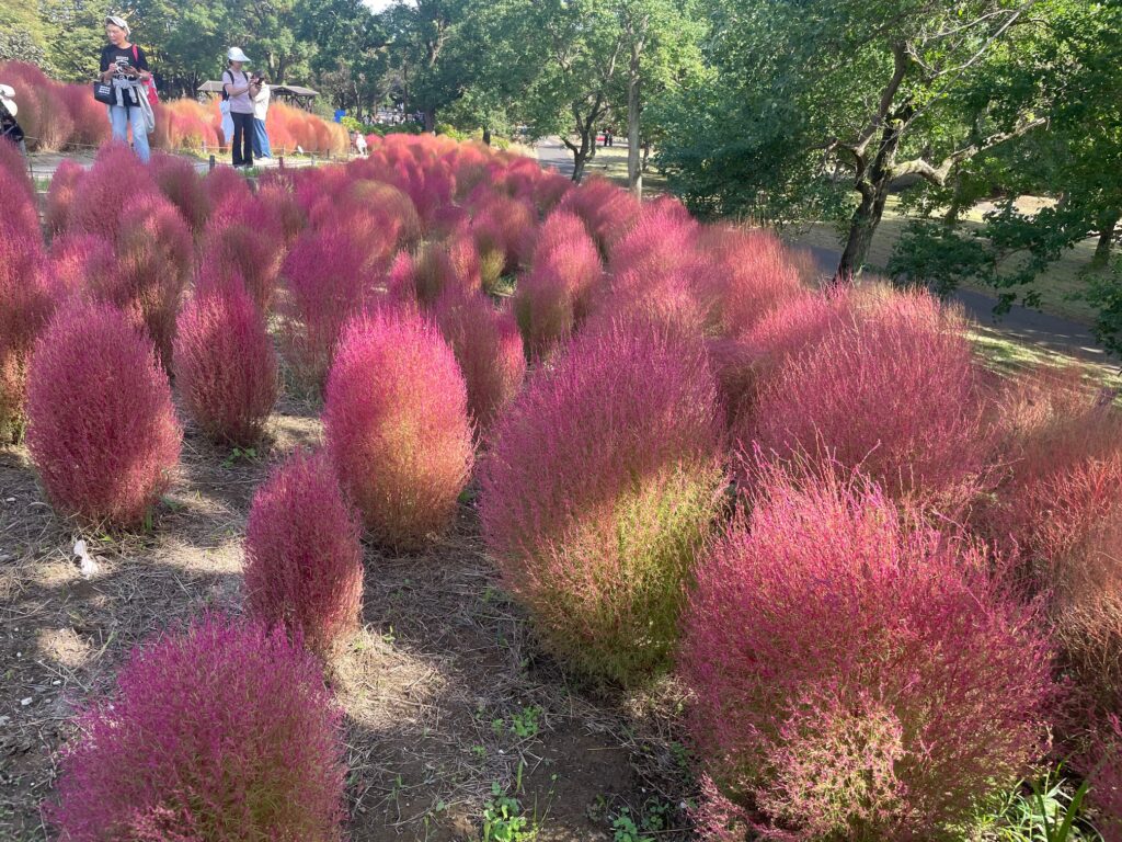 最後にご紹介するのは一足早い紅葉を楽しませてくれるコキア。小高い丘一面にコキアが植えられており、一面真っ赤に染めています。