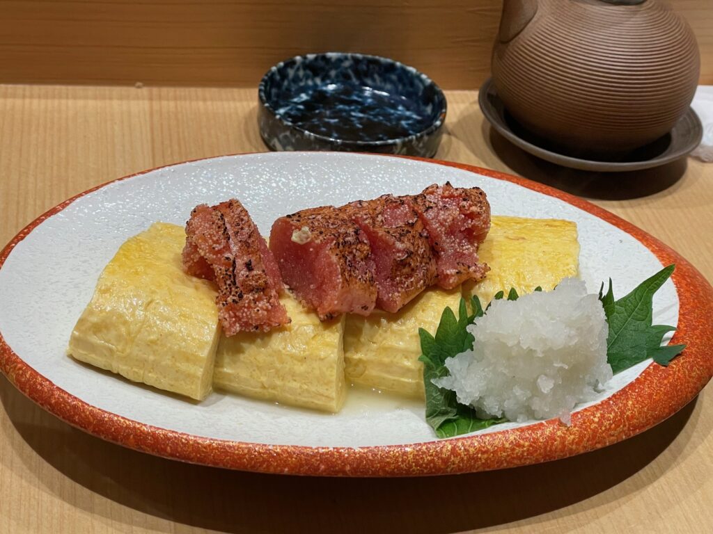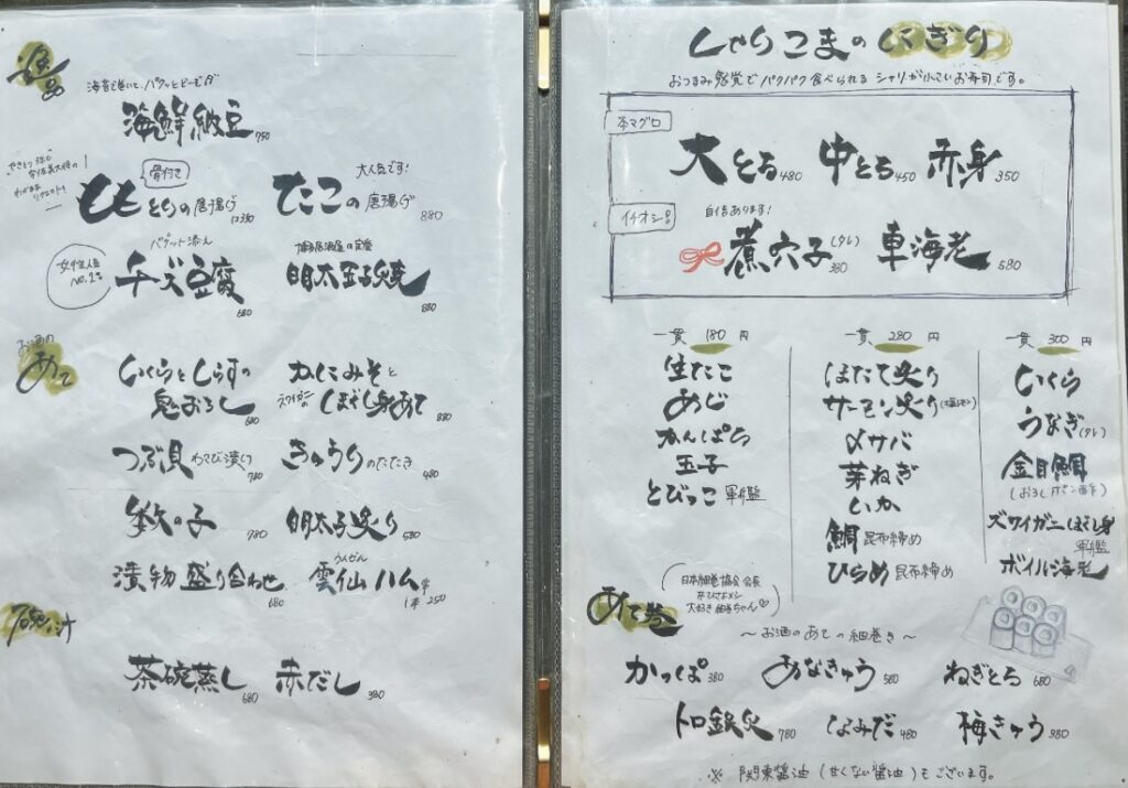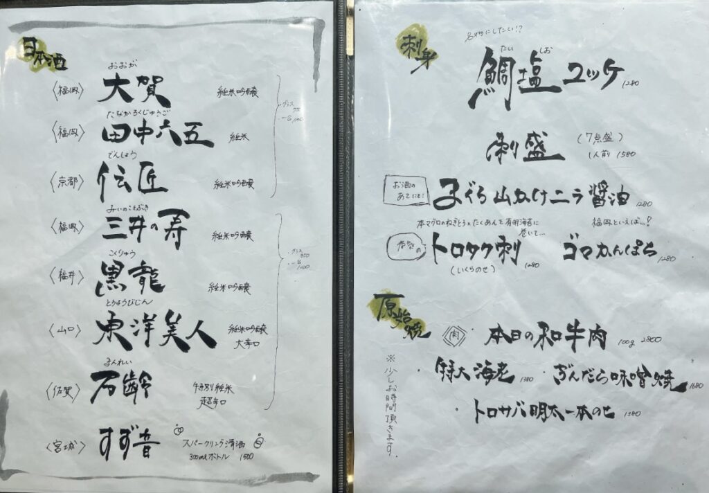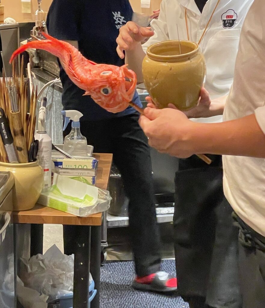 Sushi restaurants are not the only things on the menu. There is also a wide range of dishes on the menu, including robatayaki and meat dishes. There is a sunken hearth in the middle of the kitchen in front of the counter where kinki and kurumaebi (prawns) are being grilled with great gusto. It must be the restaurant’s strategy to make you want to eat just by looking at them. When I pointed my camera at him, the shop owner posed for me in a light-hearted manner.