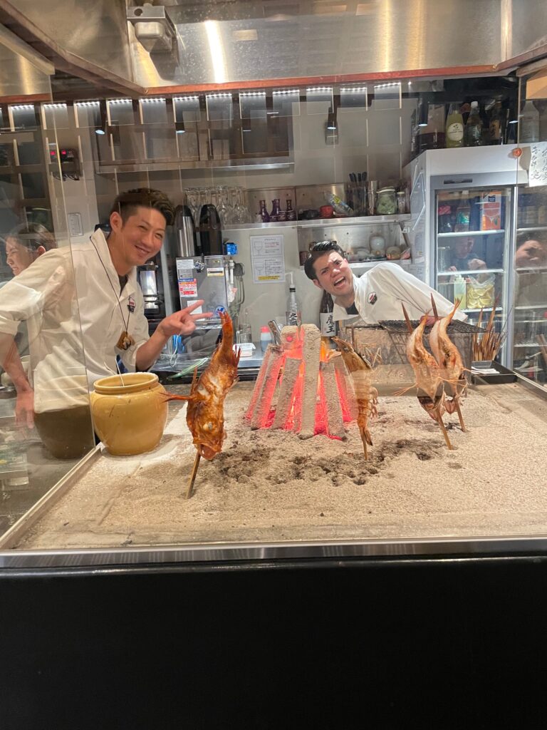 すし屋さんと言ってもメニューにあるのは寿しだけではありません。炉端焼きやら肉料理やらとメニューは盛沢山です。カウンター席の前に広がる厨房の真ん中には囲炉裏があって豪快にキンキや車エビを焼いていました。これを見るだけで食べたくなるのはお店の戦略でしょう。カメラを向けるとお店のお兄ちゃんが軽いノリでポーズをとってくれました。