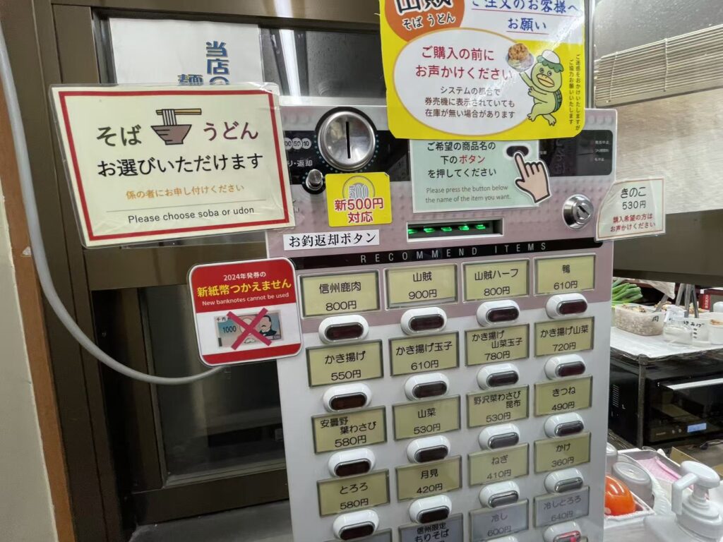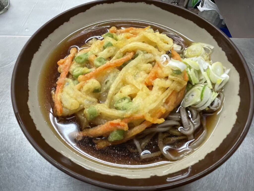 食券で買うシステムだが、券売機が新札に対応をしていない。店主に言って旧札に交換してもらい、チケットを買った。同店の売りは鳥の天ぷらの山賊蕎麦(900円)だったが、9時半と遅い朝食だったため、かき揚げ蕎麦(550円)にした。