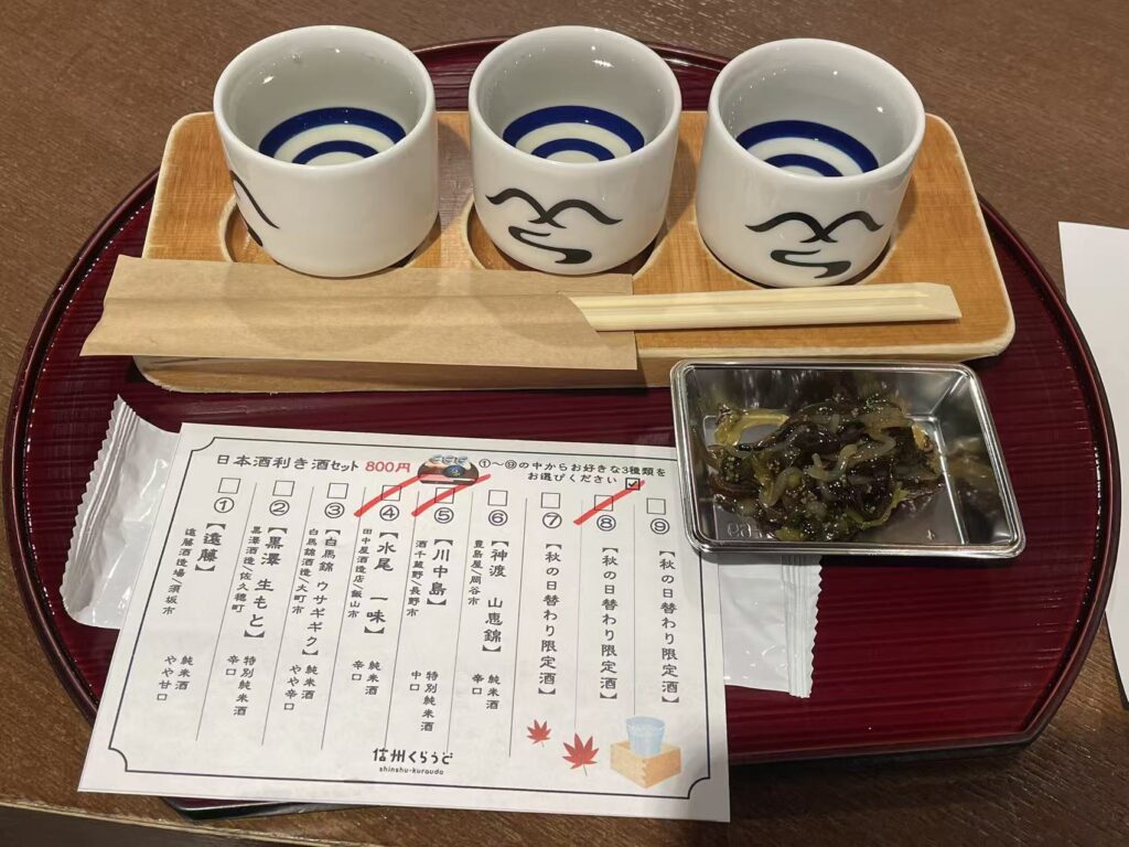 店内には、9種類ほどの日本酒(長野県の地酒)が並び、その中から3種類を選んで試飲できる立ち飲みカウンターがある(800円)。日本酒を飲むのは何年ぶりだろうと思いつつ、いくつかの銘柄をセレクトした。特に目を引いたのは、約400年前にこの地で行われた「川中島の戦い」から名を取った「川中島」という銘柄である。前に並んでいた女性客もこの酒を注文していた。筆者も折角なので、川中島を含む3種類のおちょこを受け取った。