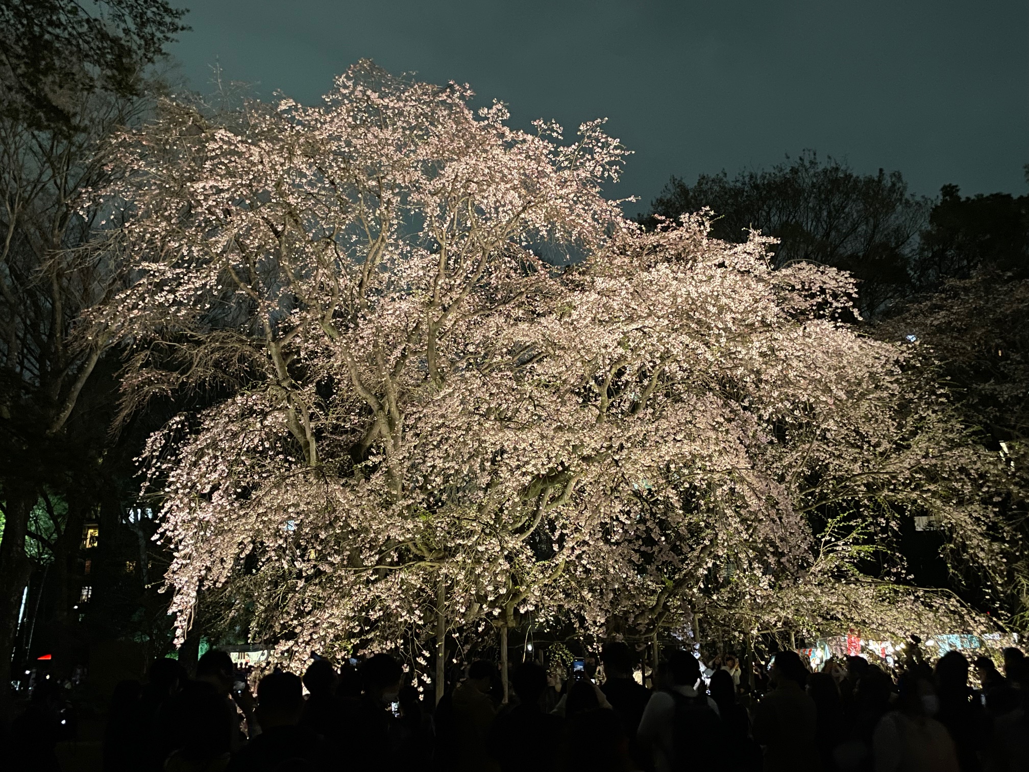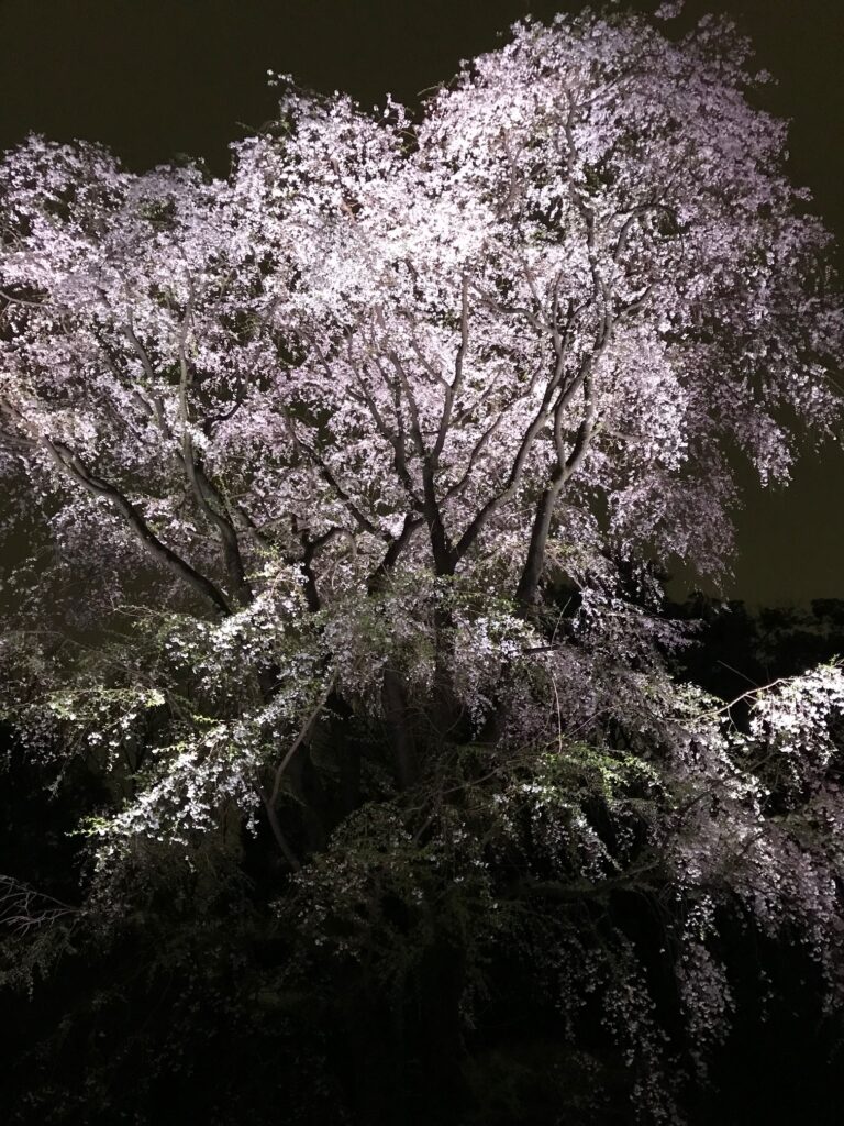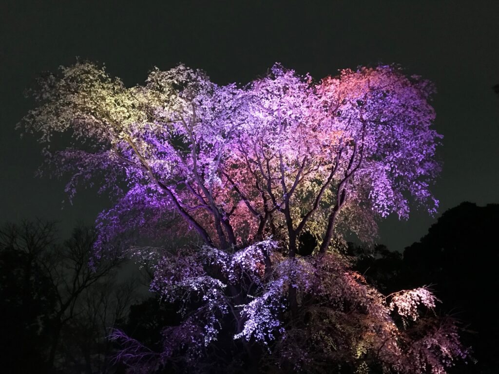 最後にご紹介をするのは六義園の枝垂れ桜。300年ほど前に作られた六義園は秋は紅葉、春は桜と見どころのある庭園です。こちらの枝垂れ桜は樹齢が70年、長年頑張って花を咲かせている由緒ある桜です。高さ15m、幅が20mと豪快な桜が夜の光の中で幻想的な世界を作り出しています。