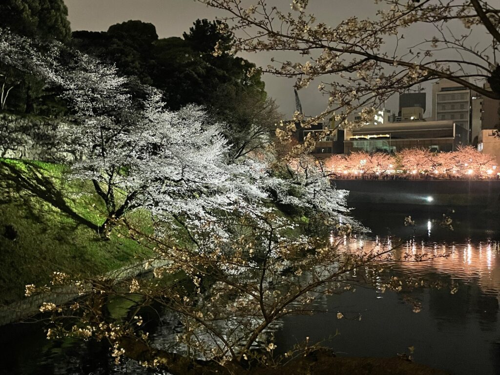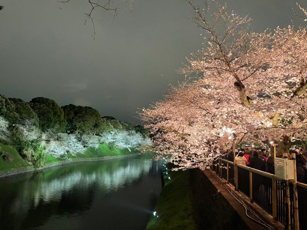 Come evening, the area is illuminated, creating a magical scene as the cherry blossoms are reflected on the water’s surface.